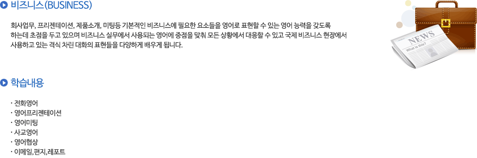 비즈니스 상황에서 많이 사용되는 어휘, 회화 중심으로 구성된 교재이다. 비즈니스 관련 전화, 프리젠테이션, 회의, 협상, 비즈니스 서류 및 서신 등을 다루고 있다. 각 단원별로 흥미로운 삽화와 더불어 어휘와 대화문 및 Test가 수록되어 있다.