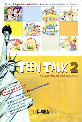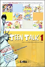 [Teen Talk]제1권. 기본적인 영어표현을 영어로 설명하고 많은 토론 주제를 제공하며 제시된 주제에 관하여 대화형식으로 구성한 책이다. 또한, 질문에 대한 다양한 의견을 제시하였고 학생들의 독해훈련과 작문연습을 위해 "READ & DISSCUSS"를 추가하였다.
